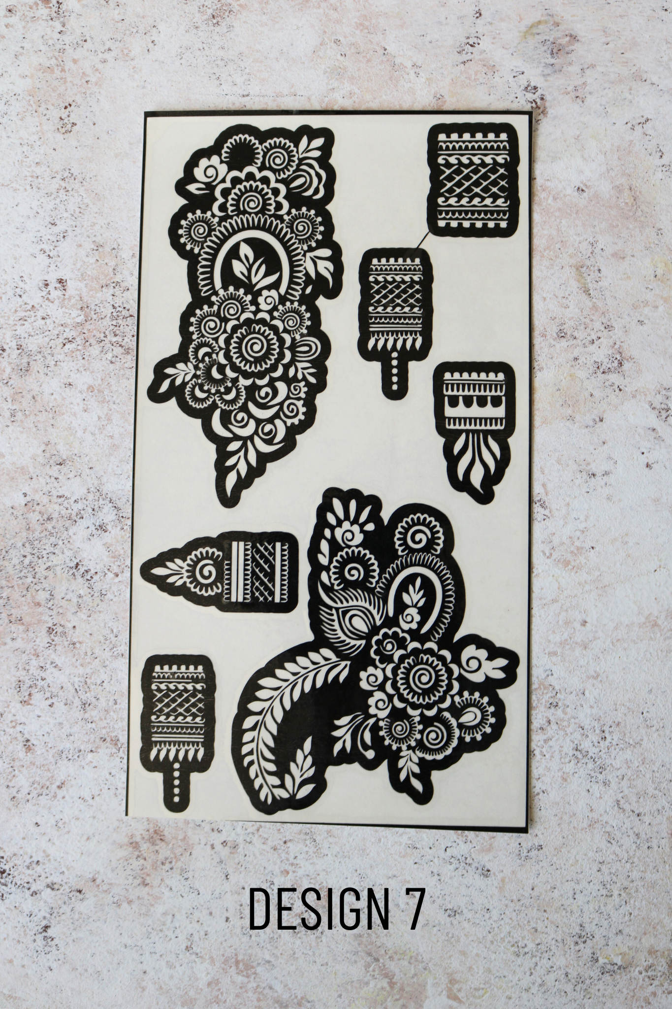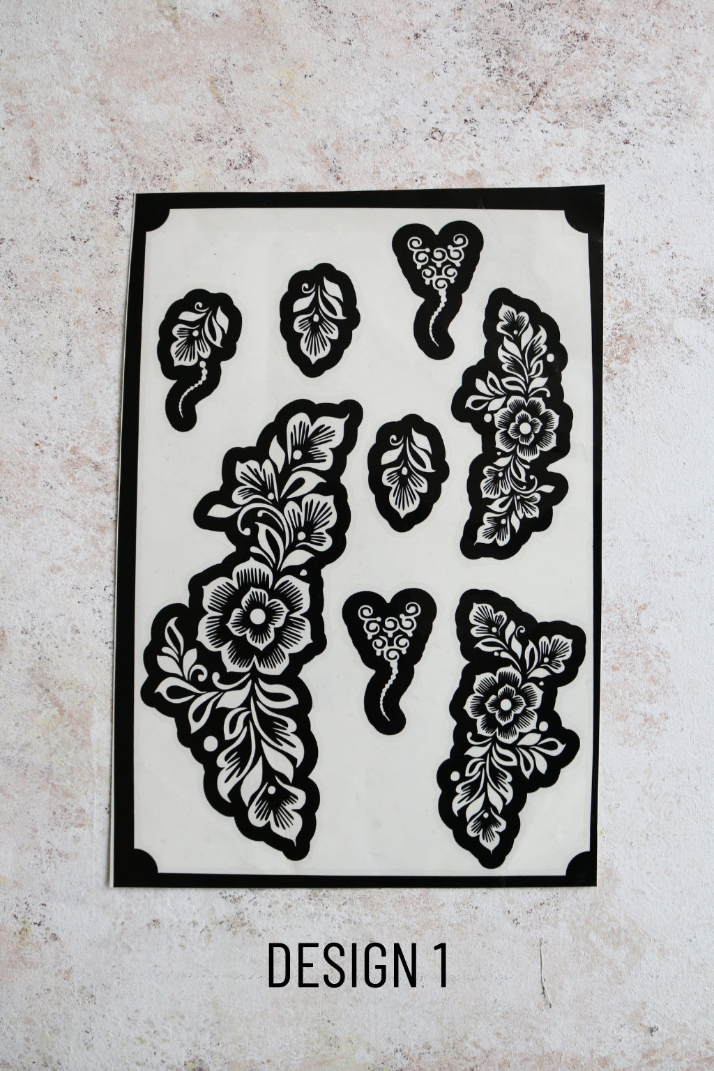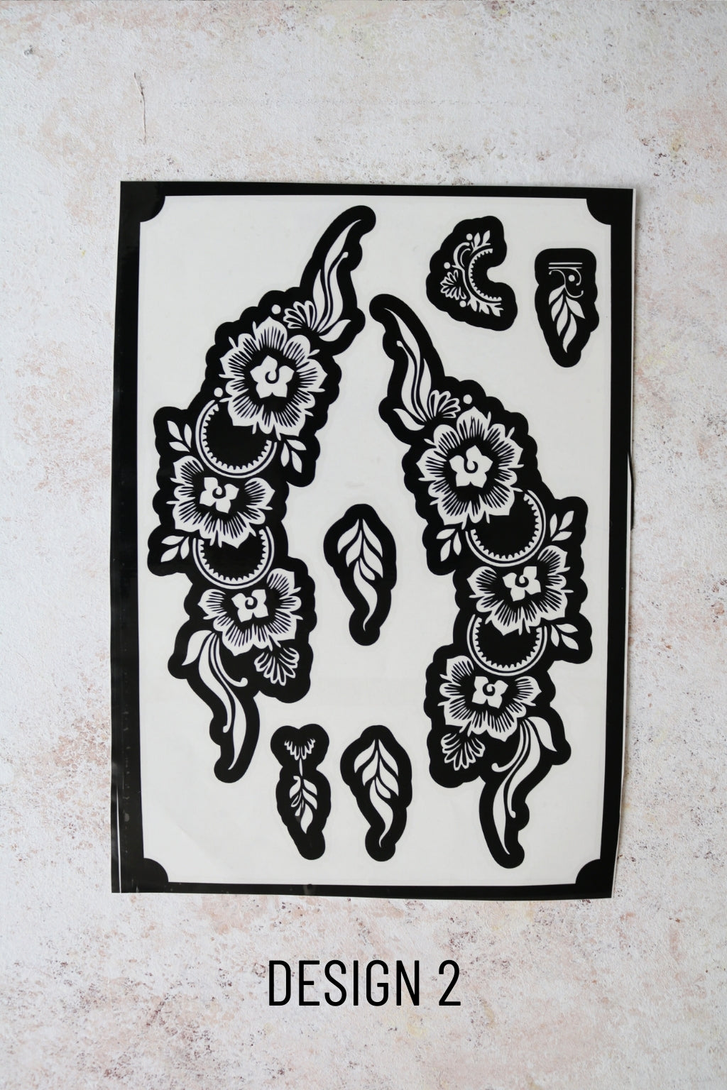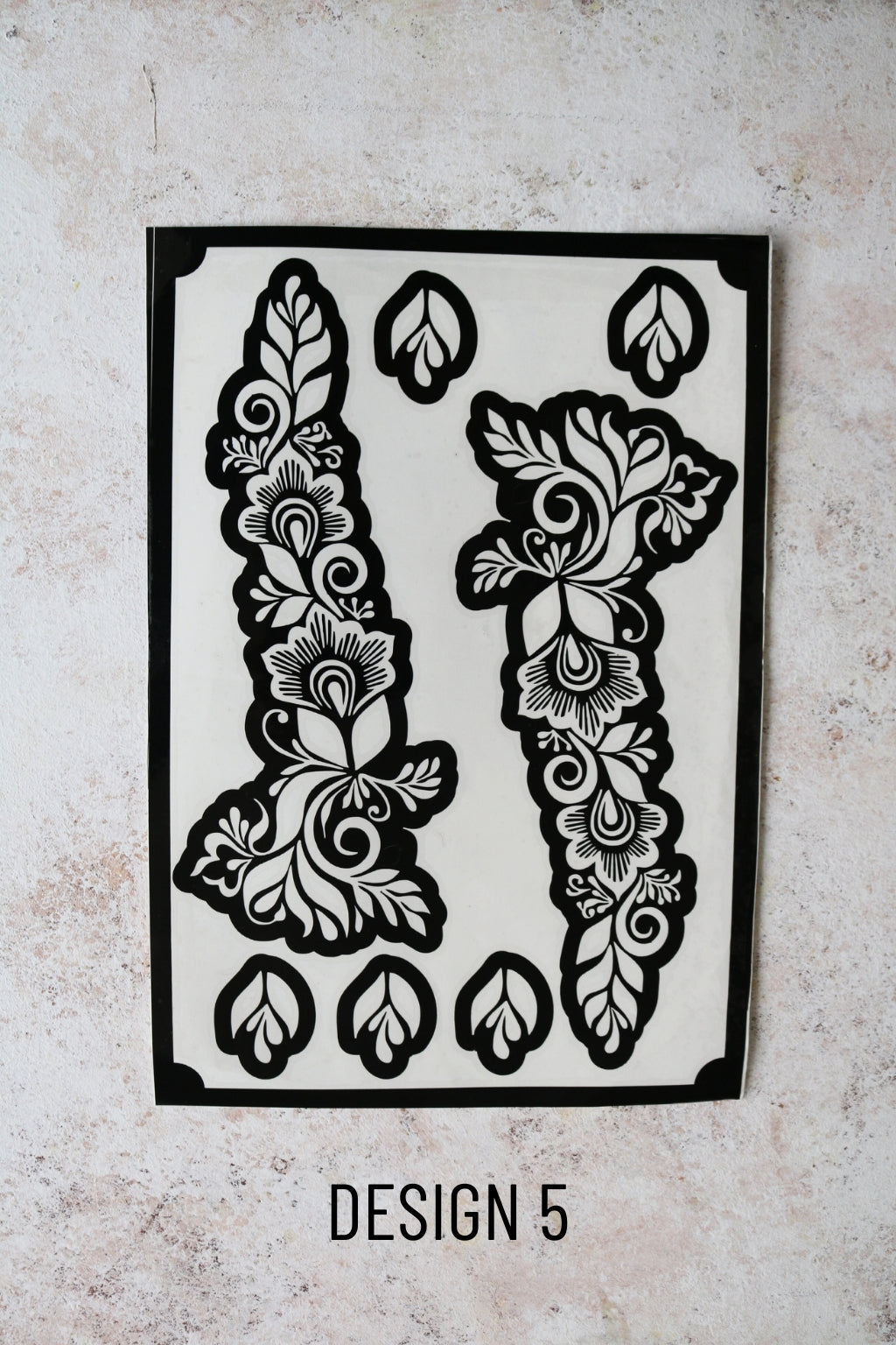 Get beautiful henna designs effortlessly with henna stencils! Henna stencils are made of adhesive vinyl sticker and are used for tracing temporary tattoos on the skin. Simply stick it on your hand and fill in the design with a henna cone! Our stencils feature gorgeous henna designs and are very easy to use!