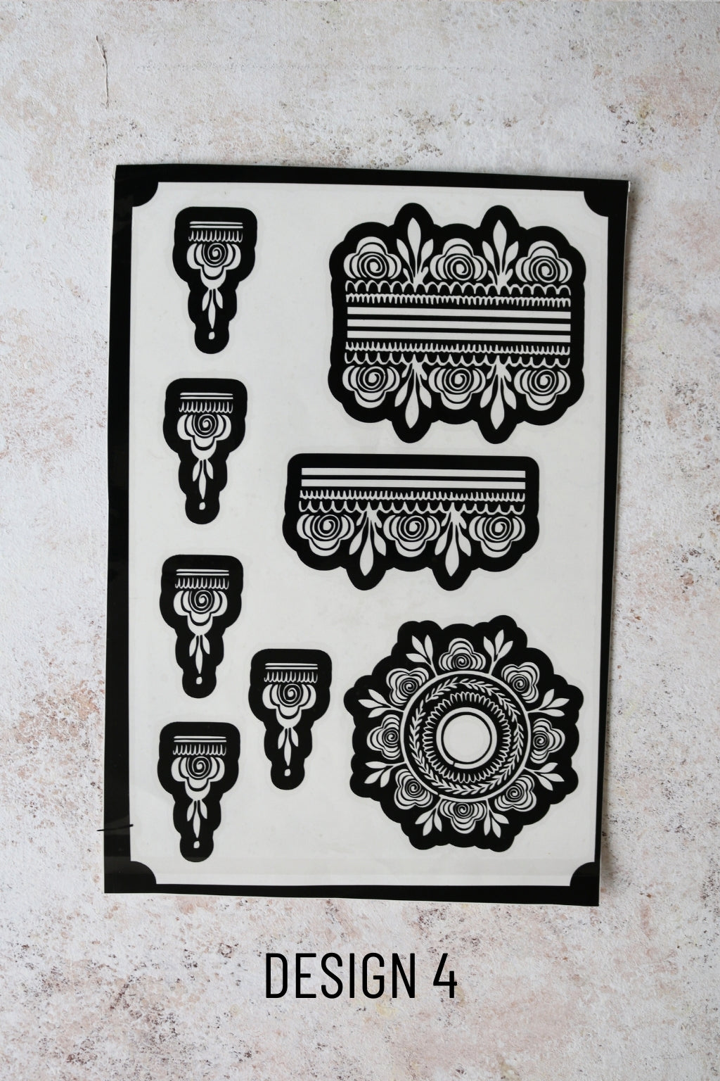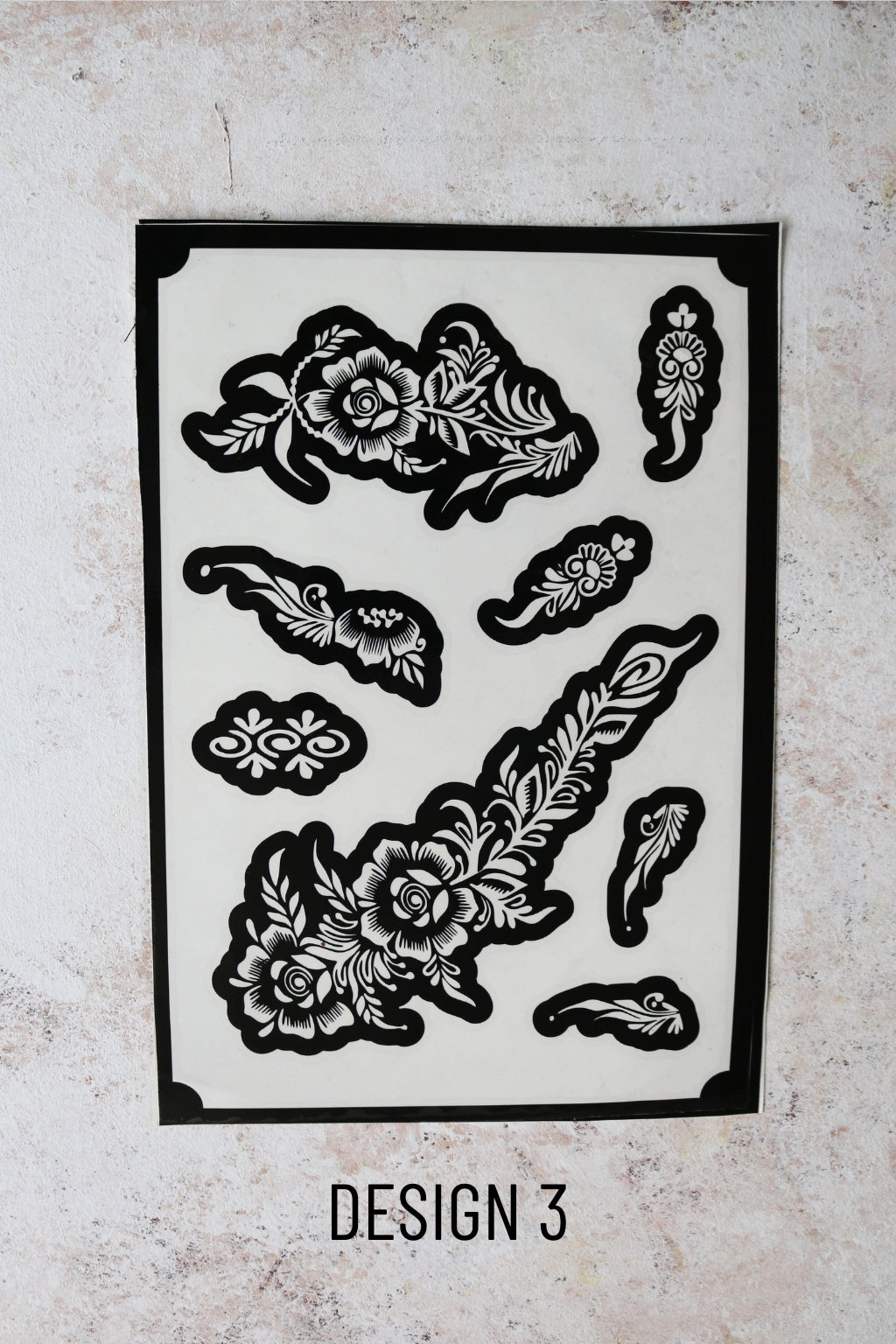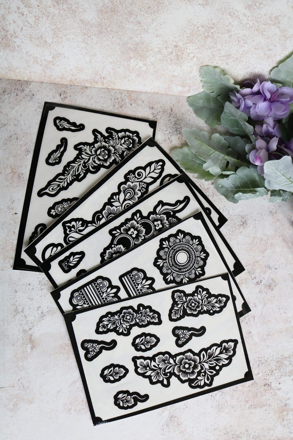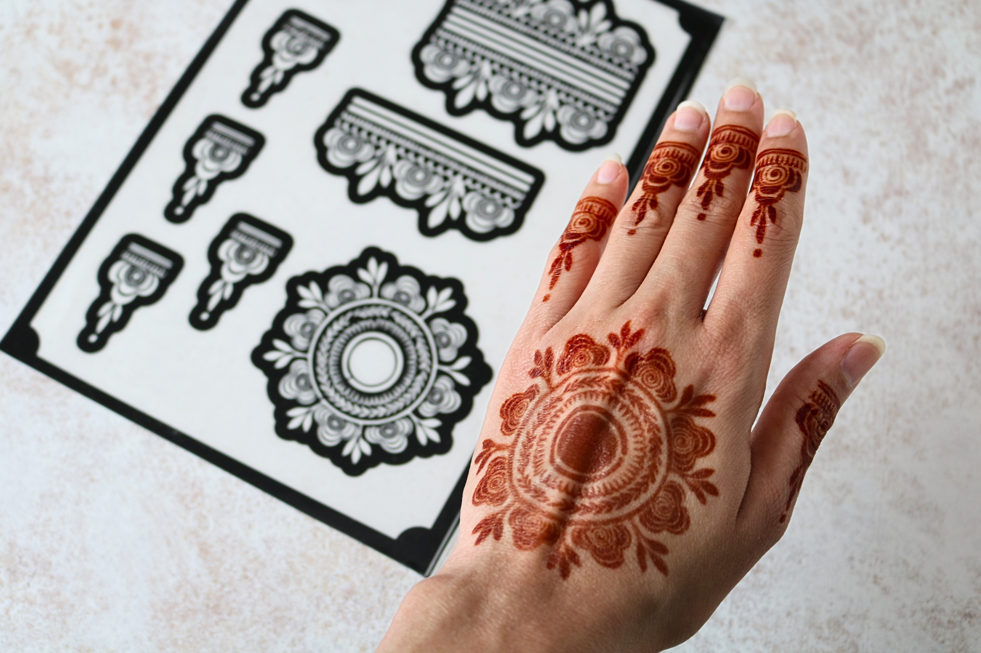 Get beautiful henna designs effortlessly with henna stencils! Henna stencils are made of adhesive vinyl sticker and are used for tracing temporary tattoos on the skin. Simply stick it on your hand and fill in the design with a henna cone! Our stencils feature gorgeous henna designs and are very easy to use!