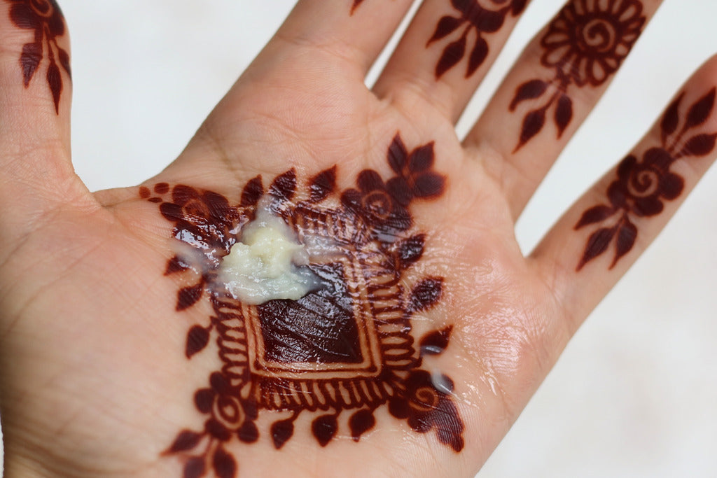 After removing dried henna paste, apply a generous amount of aftercare balm over fresh henna stain. If the henna paste is hard to remove, apply the balm over it and then scrape it off with a spoon. Apply several times daily to make sure the stain deepens to its full potential and to make the stain last longer.