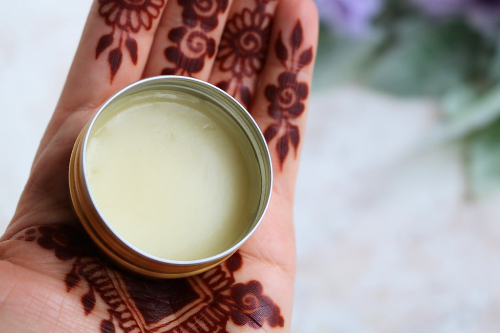 Aftercare balm is applied on the skin after removing henna paste to keep the henna stain moisturized and protected. The balm forms a barrier on the skin that protects the fresh henna stain from exposure to water, soap, etc. enabling the stain to deepen to its full potential. Repeated use of the balm also makes the henna stain last longer. Our Aftercare balm is made with organic ingredients, contains no chemicals/preservatives, and comes in a lovely reusable tin!